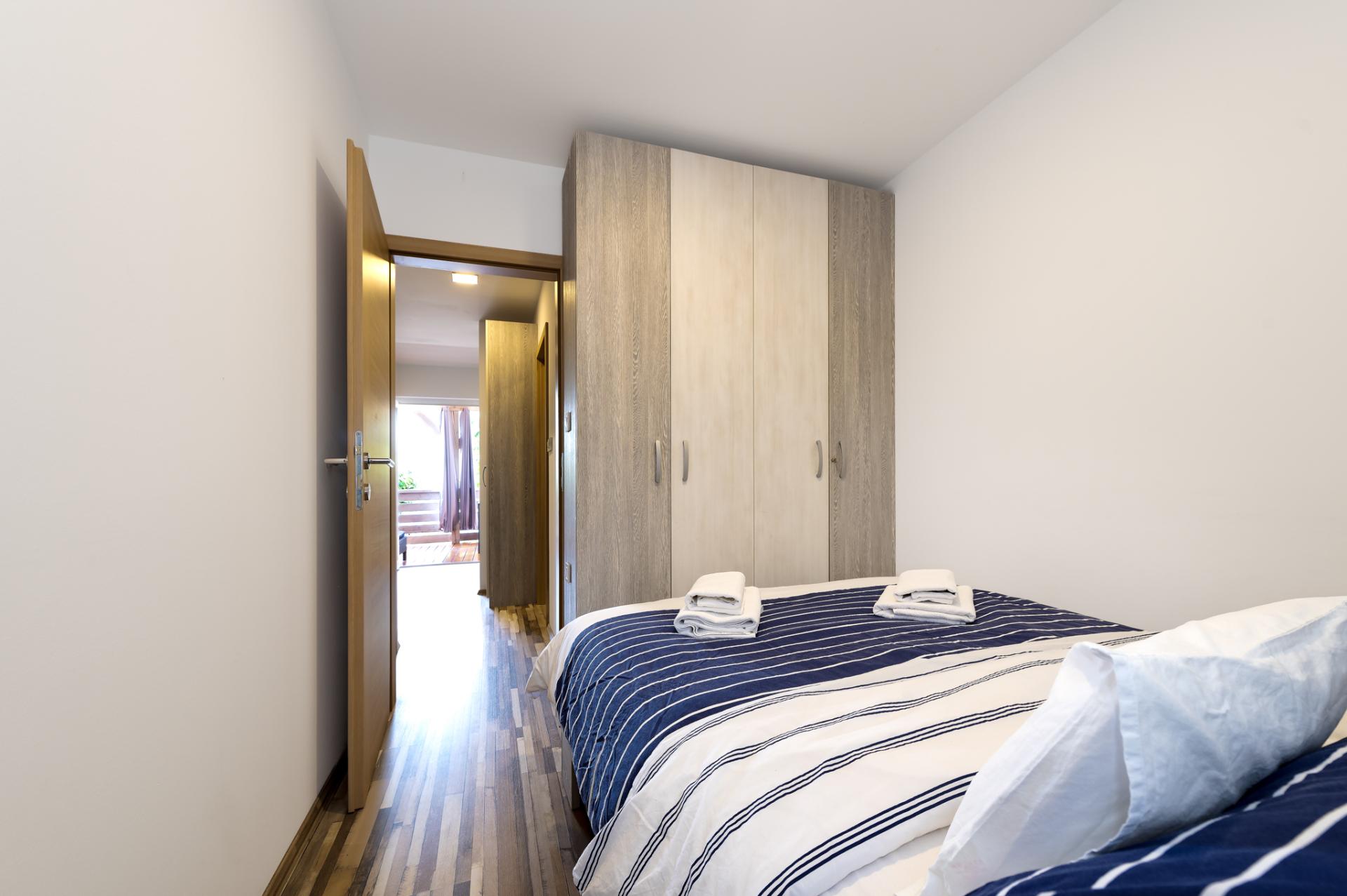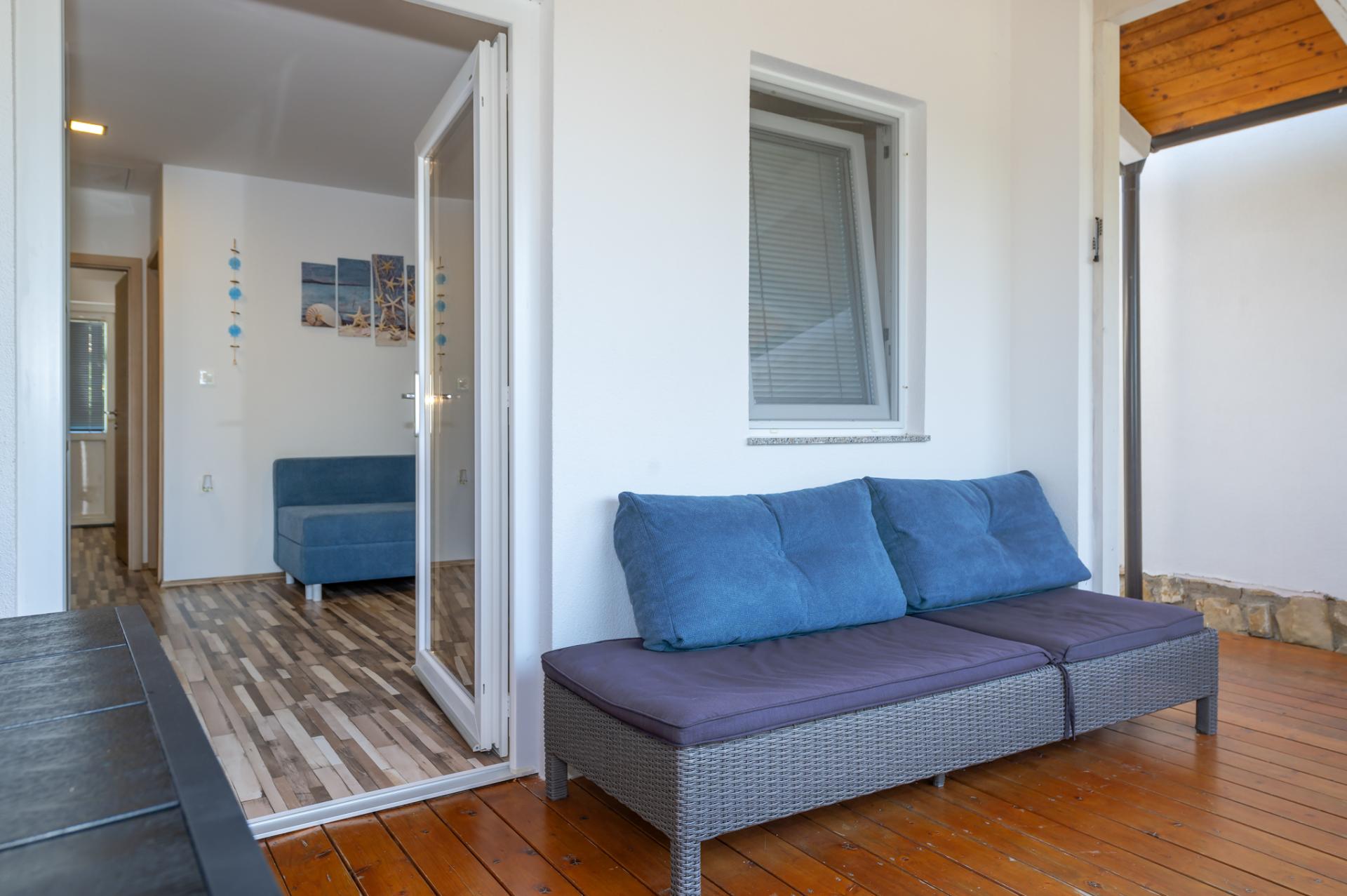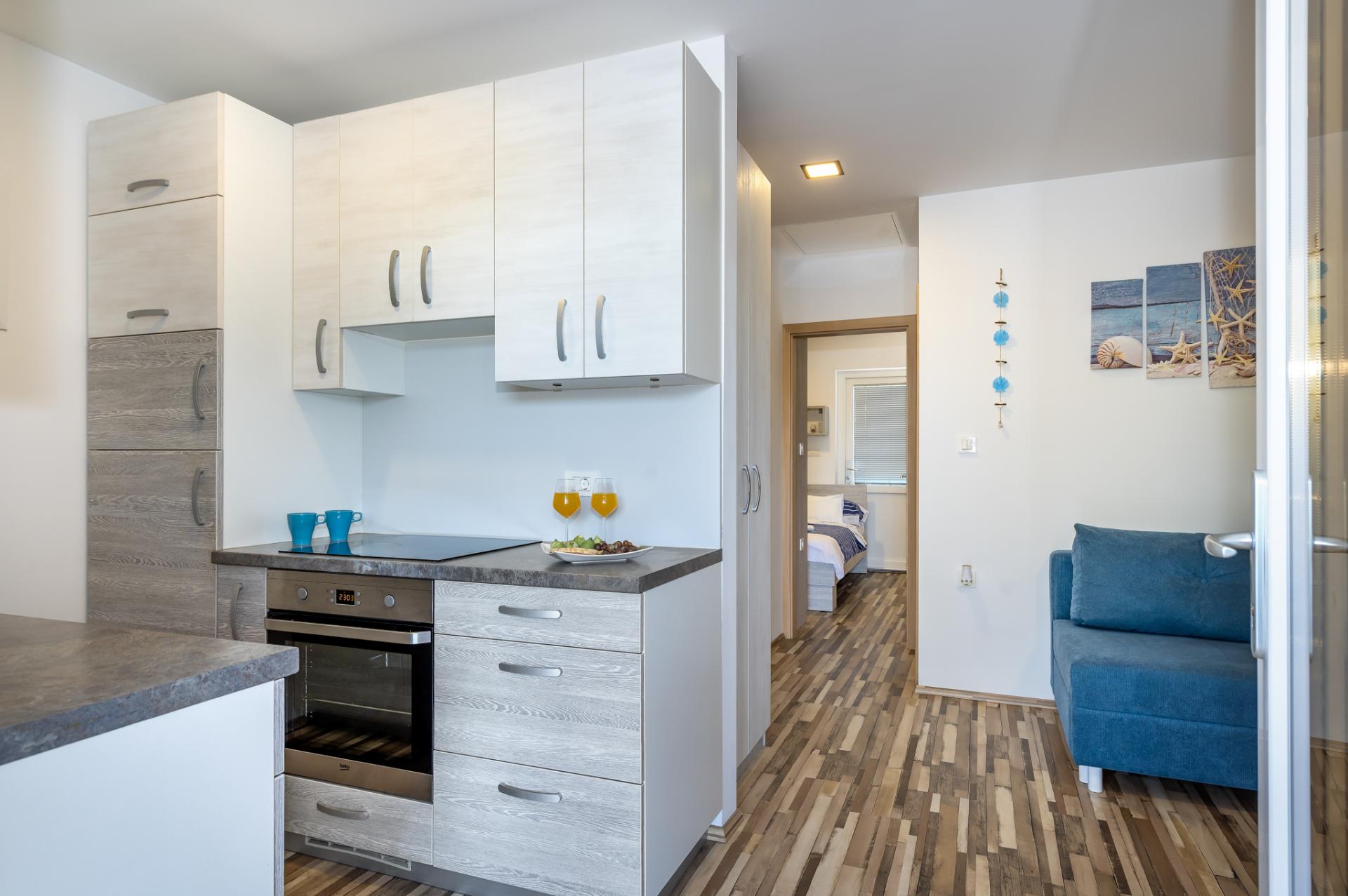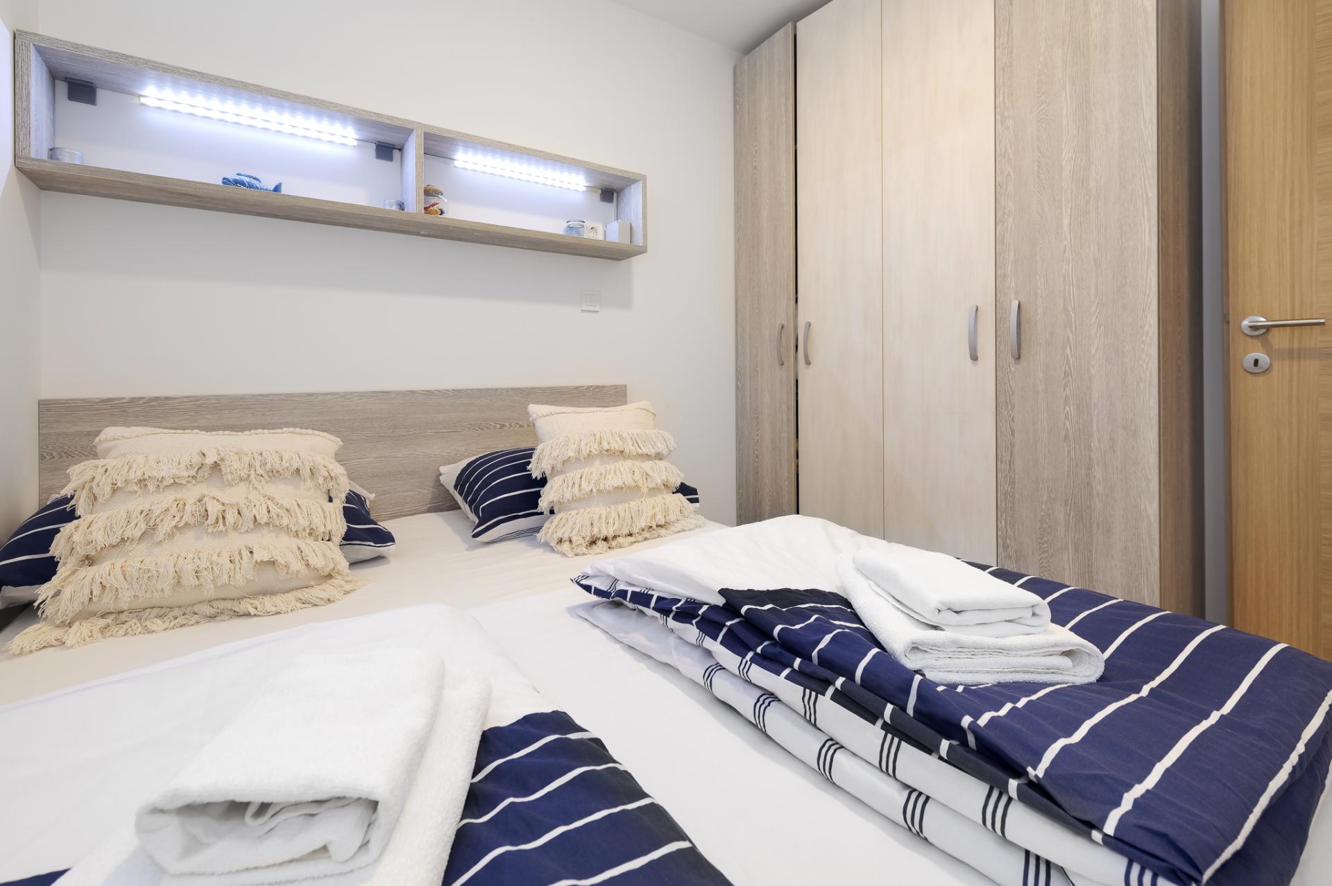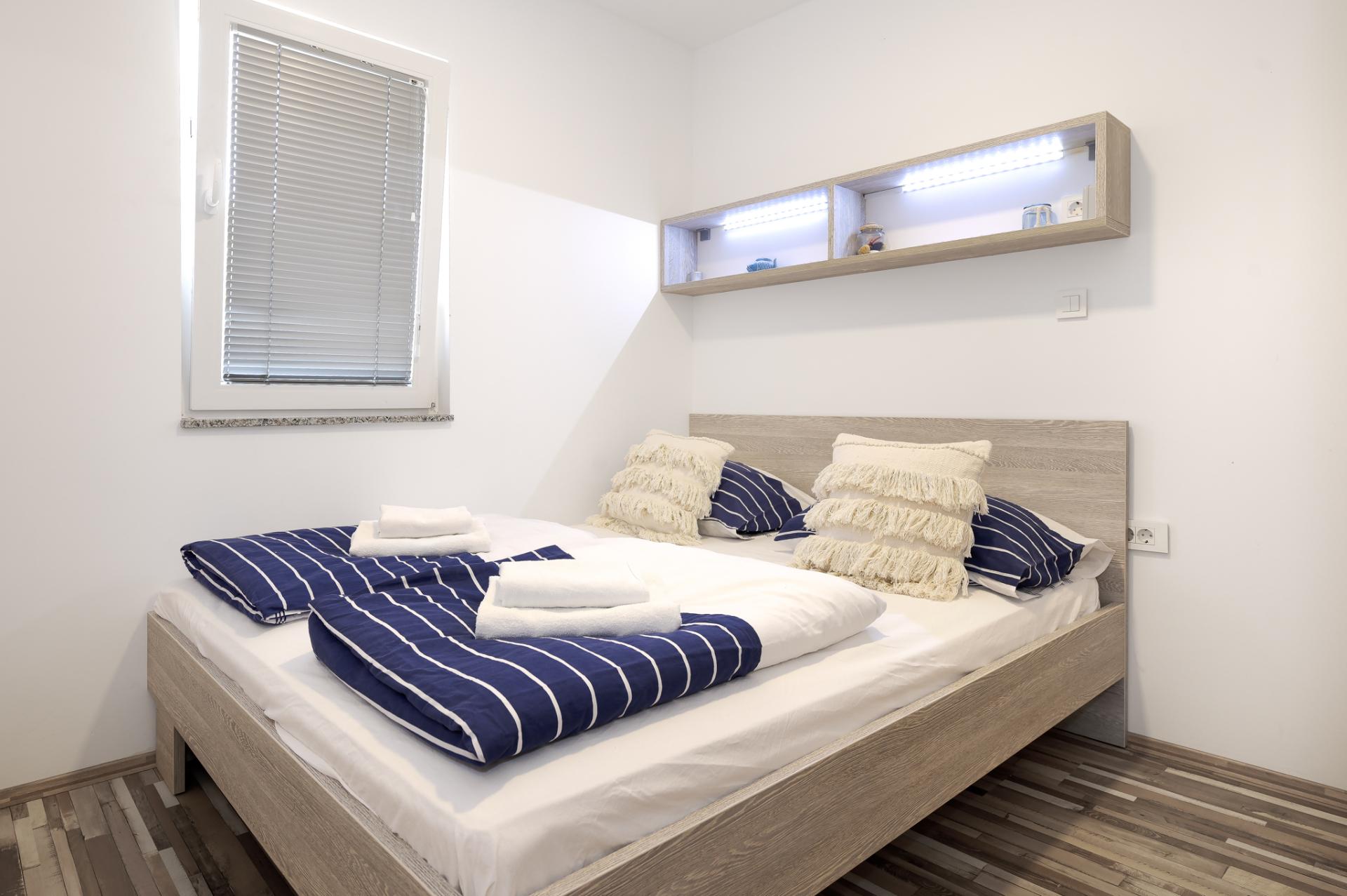 Accommodates 6 people in 2 bedrooms and livingroom. Both bedrooms have double bed and we offer a comfortable sofa in living room for 2 extra people. Next to the bedroom is a bathroom with a shower and a toilet. Fully equipped kitchen has a dishwasher, fridge, freezer, oven, cook, dishes, kitchen linen... In the living room is situated SAT TV and air condition. Free WIFI is avalable in whole home. You can also relax at spacious terrace overlooking the sea. Dimensions of a Octopus Home are 40 m2.
