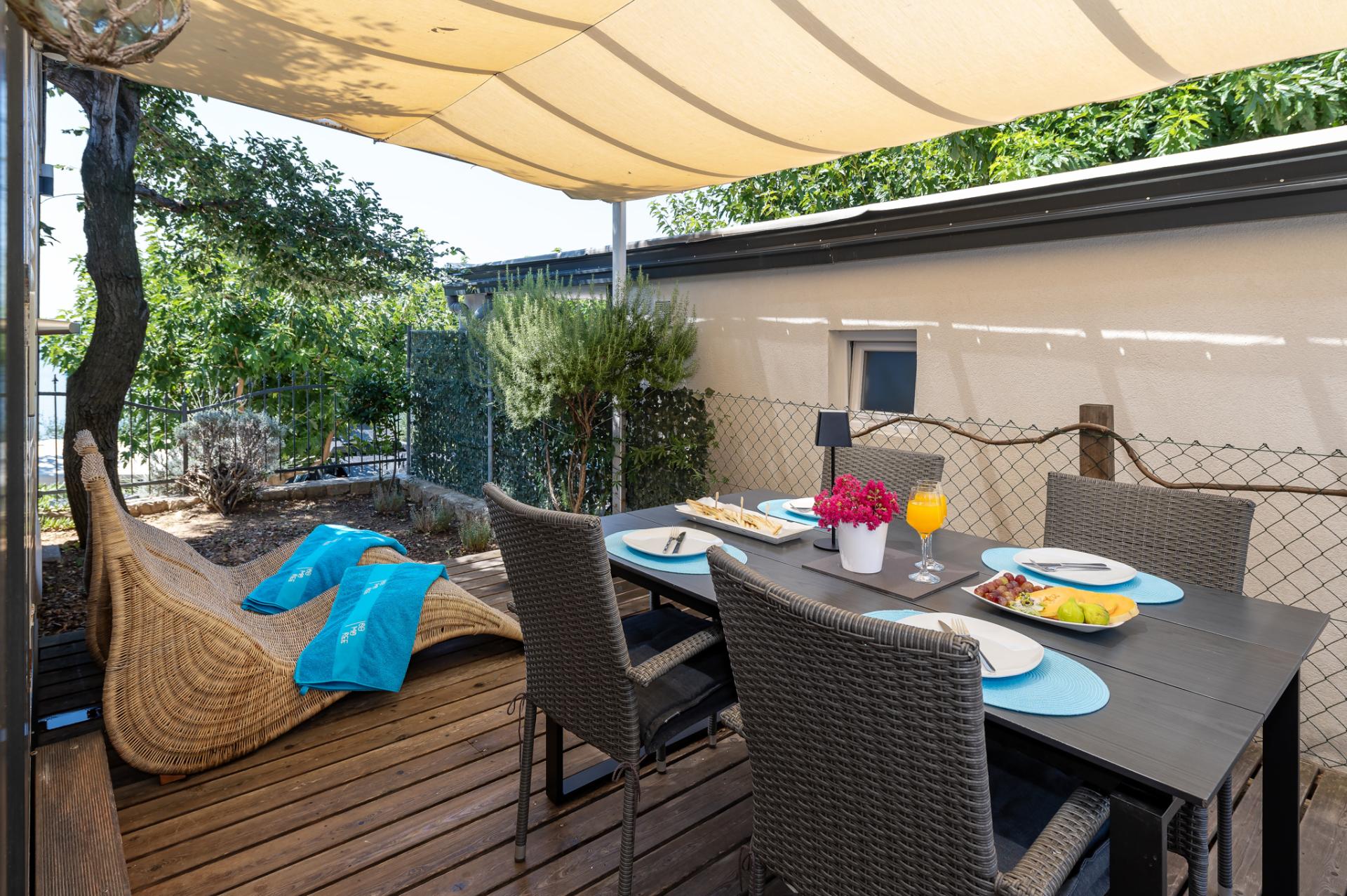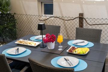 From the terrace there is a beautiful view of the bay and the beach. It is 15 m2 bid and equipped with table and chairs. Free parking is nearby (20 meters maximum or closer depending on availability).