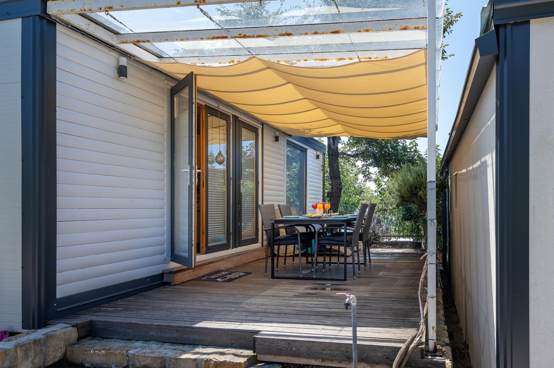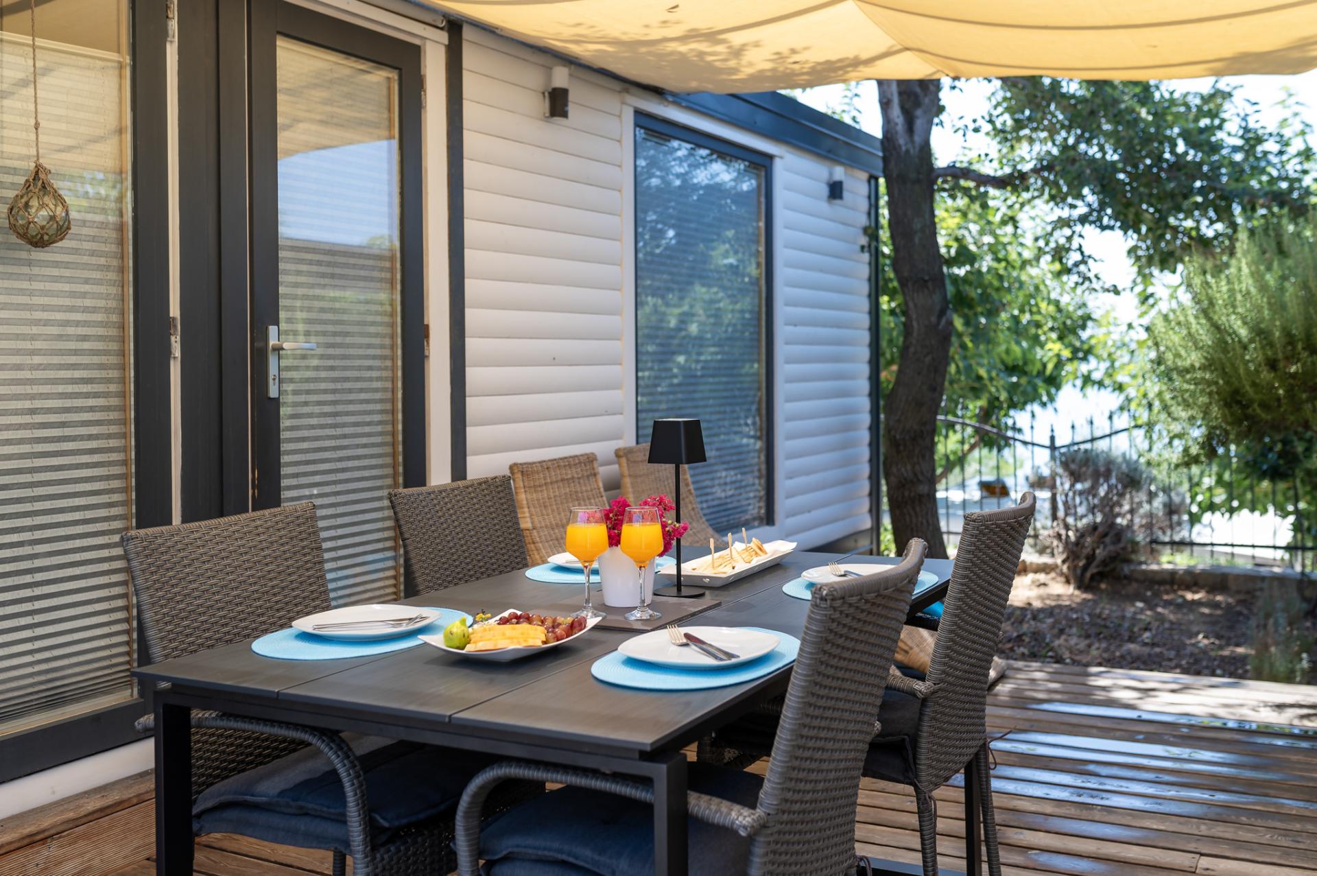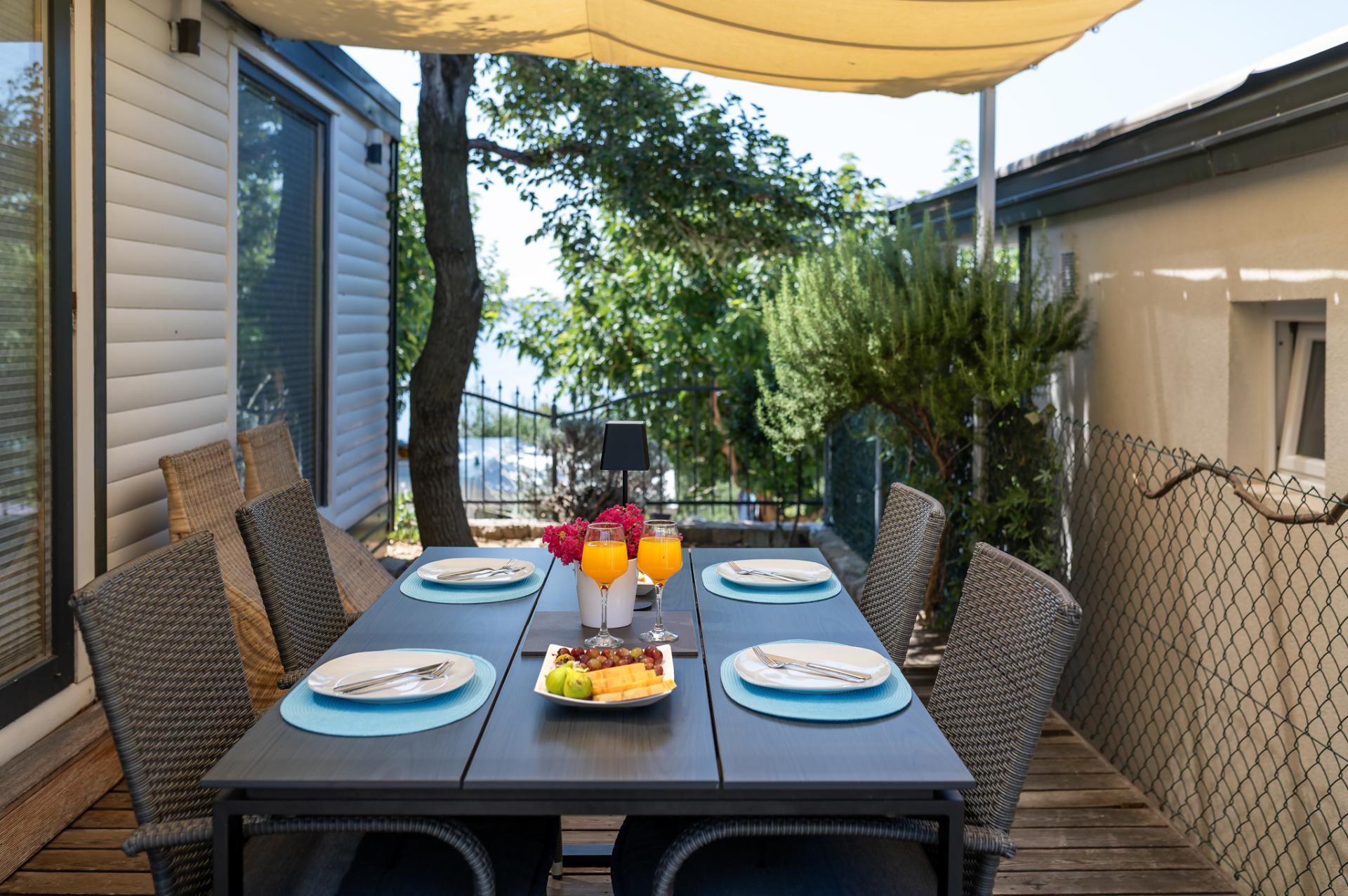 It is predestinated for 4 persons. One big double bed is hidden in a dining room wall. You open it in the evening and close it back in the morning to have more space during the day. The same foldable bed is also hidden behind sofa in a living room. Living room offers SAT TV and air-condition. In the middle is situated the kitchen with a cooker, oven, fridge and all dishes. Behind the kitchen is spacious bathroom with a shower. Anchor Home has also spacious and private terrace. You have WIFI covered in all mobile home. Dimensions in total are 28 m2.