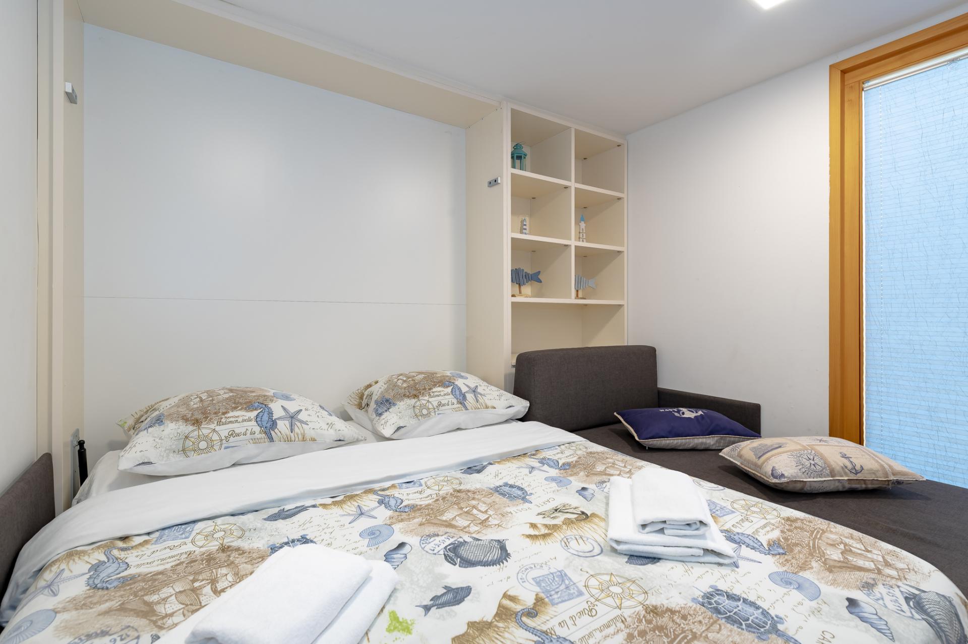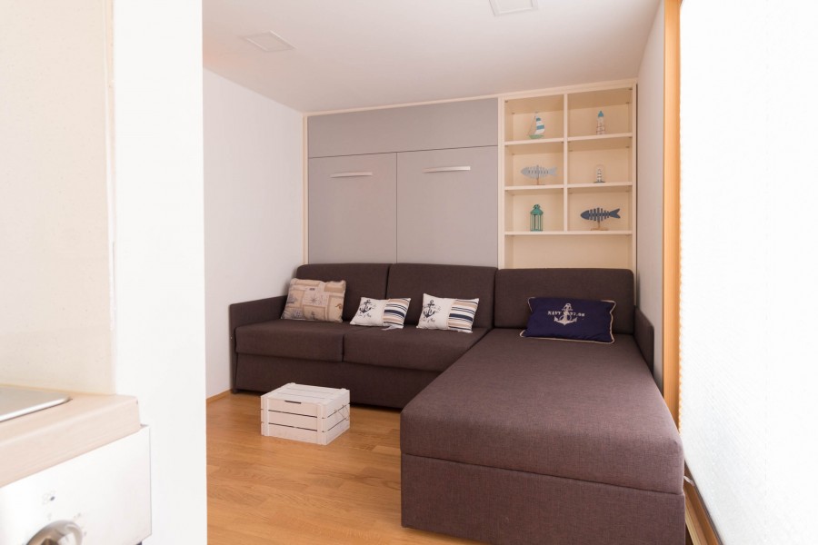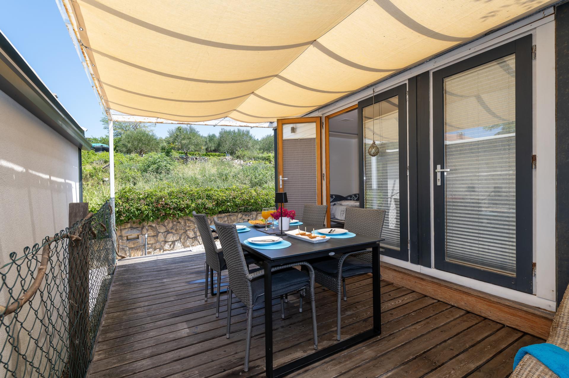 It is predestinated for 4 persons. One big double bed is hidden in a dining room wall. You open it in the evening and close it back in the morning to have more space during the day. The same foldable bed is also hidden behind sofa in a living room. Living room offers SAT TV and air-condition. In the middle is situated the kitchen with a cooker, oven, fridge and all dishes. Behind the kitchen is spacious bathroom with a shower. Anchor Home has also spacious and private terrace. You have WIFI covered in all mobile home. Dimensions in total are 28 m2.