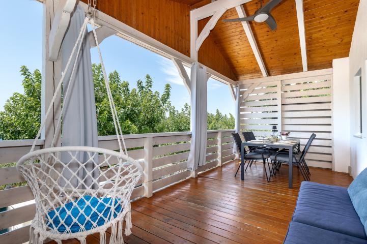 Dalla terrazza si estende una magnifica vista sulla baia e spiaggia. La terrazza ha 15 mq con tavolo e sedie. Nelle vicinanze (al massimo 20 metri oppure più vicino e secondo la disponibilità) si trova il parcheggio che è gratis.