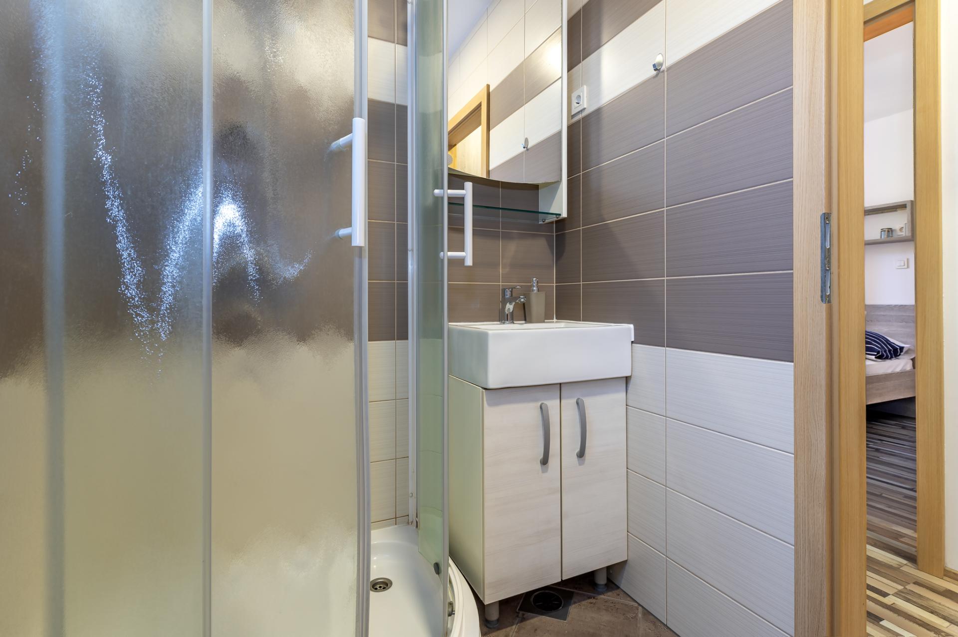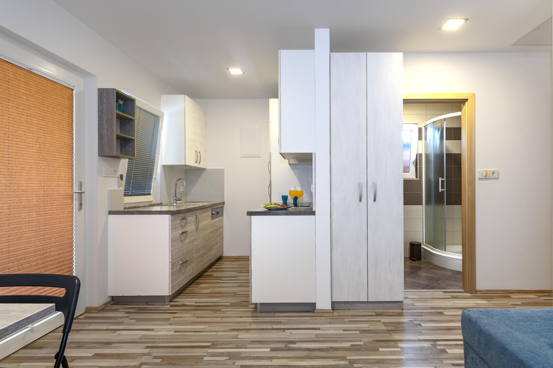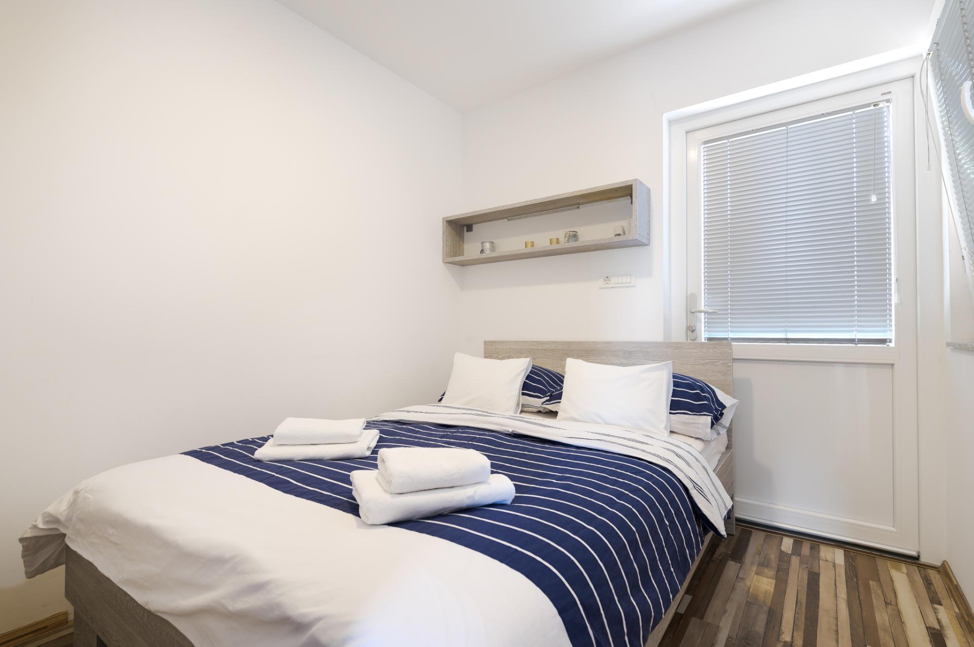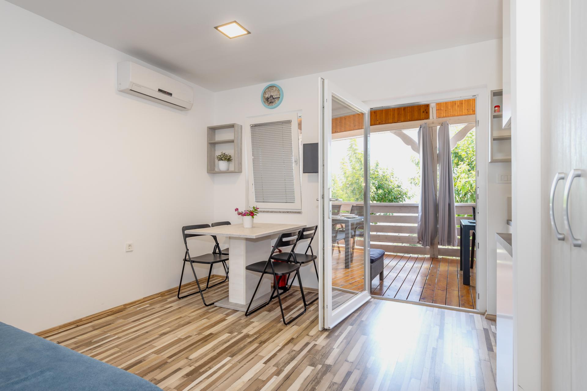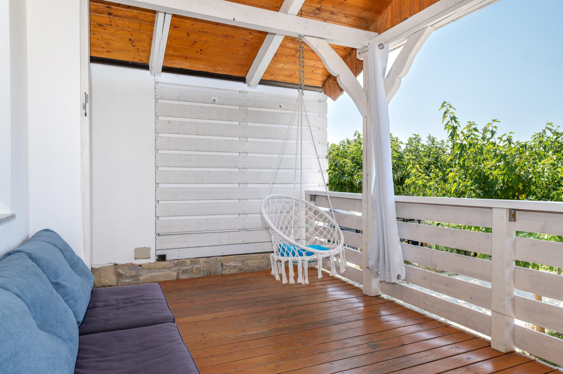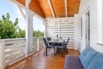 Dalla terrazza si estende una magnifica vista sulla baia e spiaggia. La terrazza ha 15 mq con tavolo e sedie. Nelle vicinanze (al massimo 20 metri oppure più vicino e secondo la disponibilità) si trova il parcheggio che è gratis.