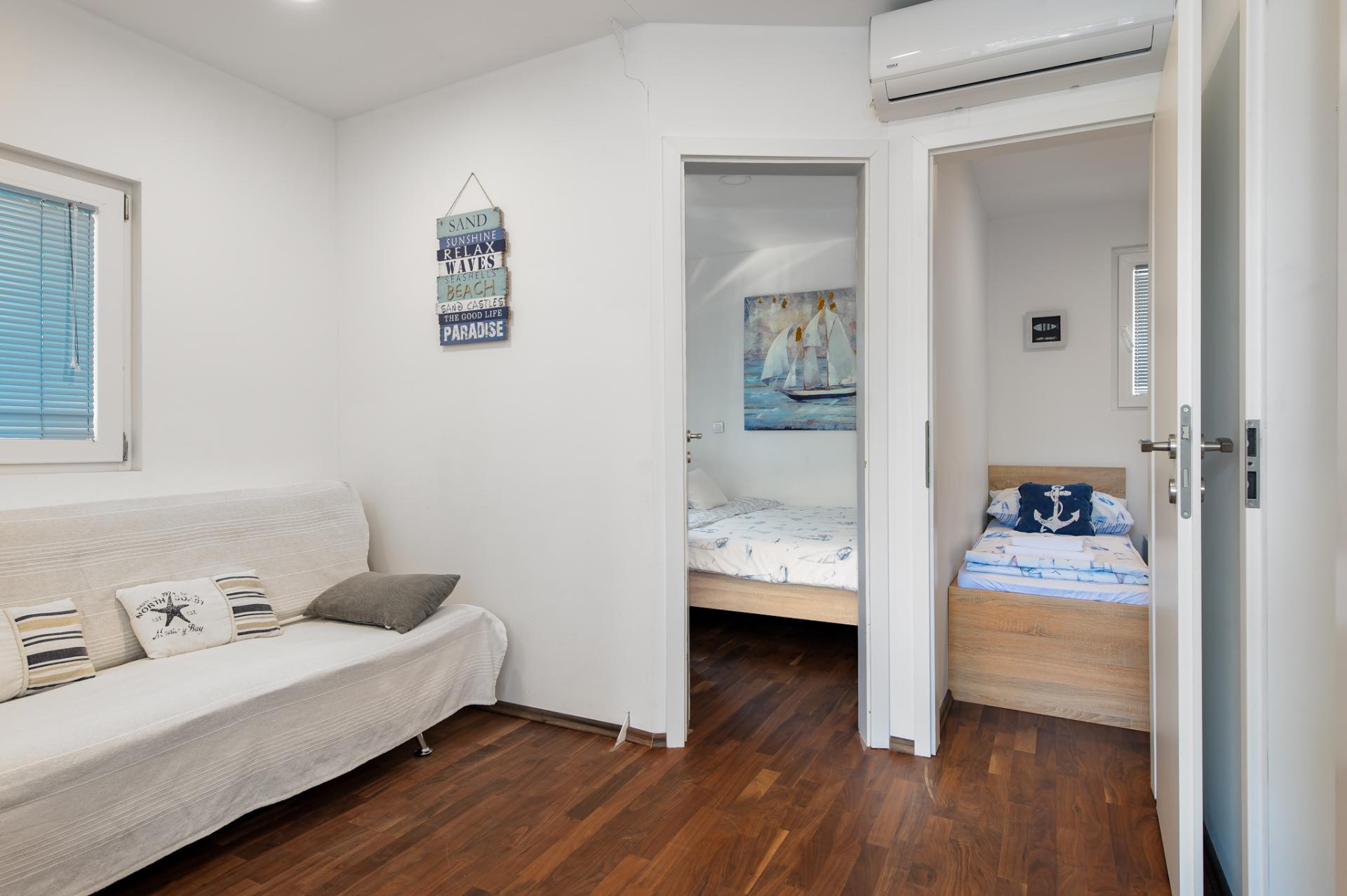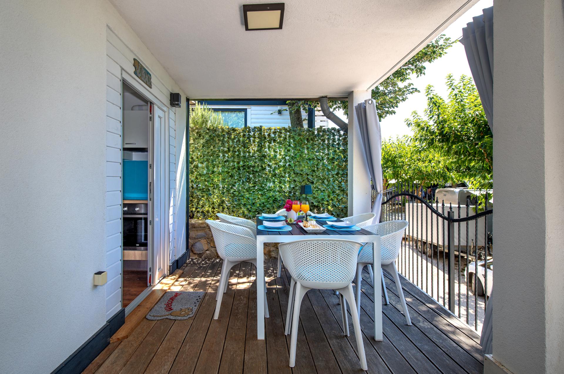 Può ospitare 6 persone. È stato progettato nei colori blu navy e turchese della spiaggia. Offre due camere da letto, una con letto matrimoniale, una con 2 letti singoli separati. 2 persone extra possono dormire sul divano del soggiorno e godersi la TV satellitare dal letto. Accanto alla camera c'e' un bagno con doccia e wc. La cucina è completamente attrezzata con stoviglie, forno, piano cottura, forno a microonde, frigorifero ... Casa Spiaggia ha WIFI sulla disposizione e aria condizionata. L'ampia terrazza offre privacy con una tenda da altre case mobili. Le dimensioni sono 32 m2.