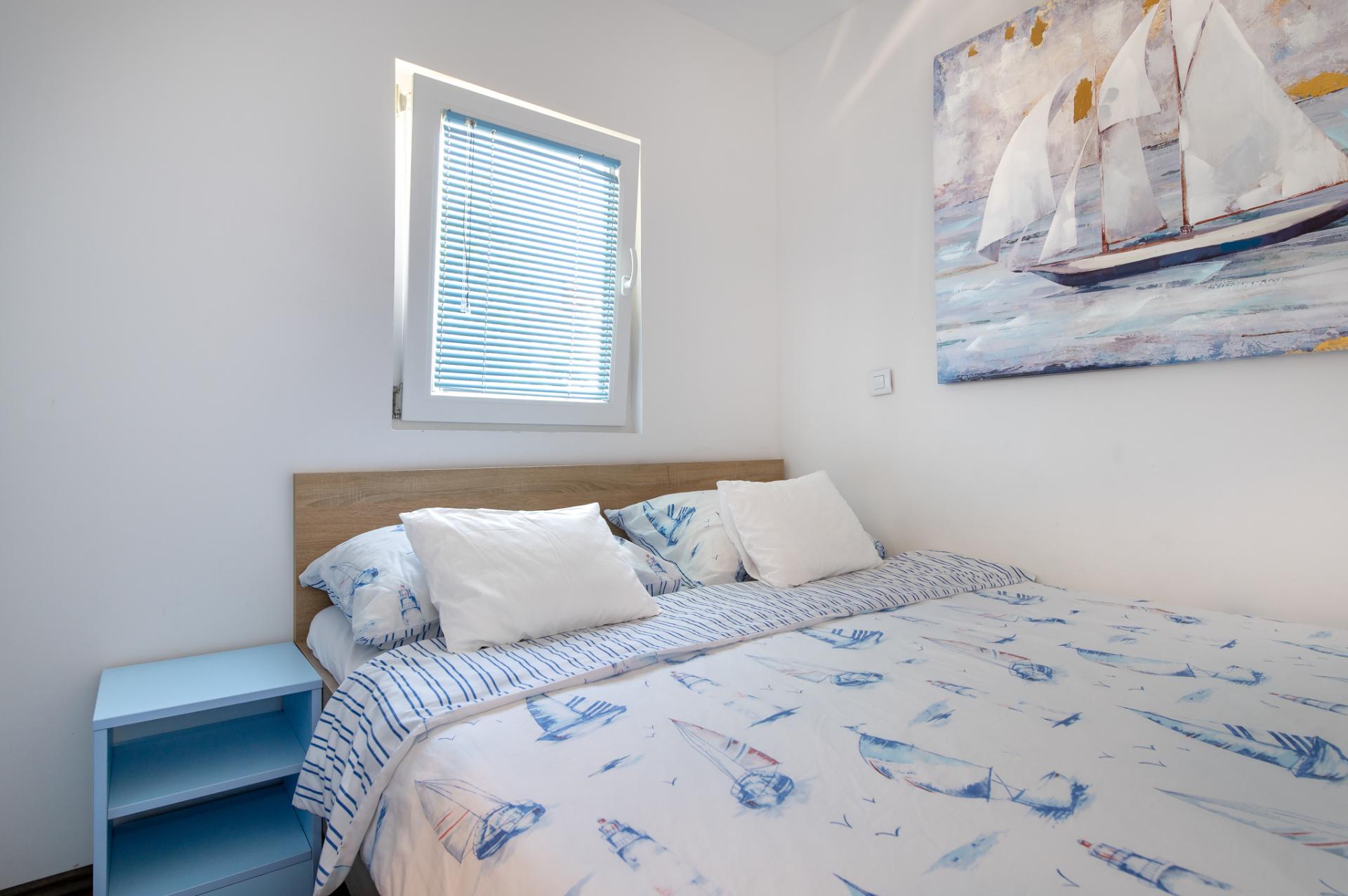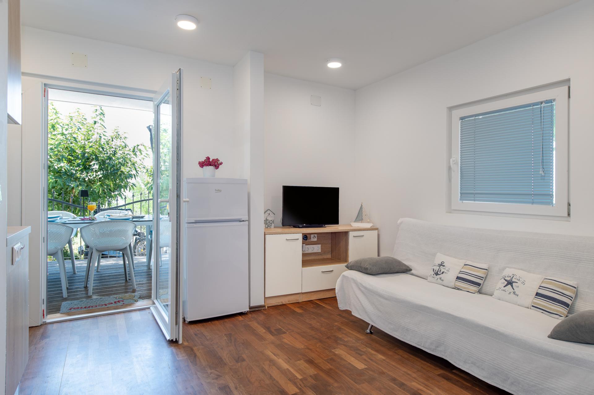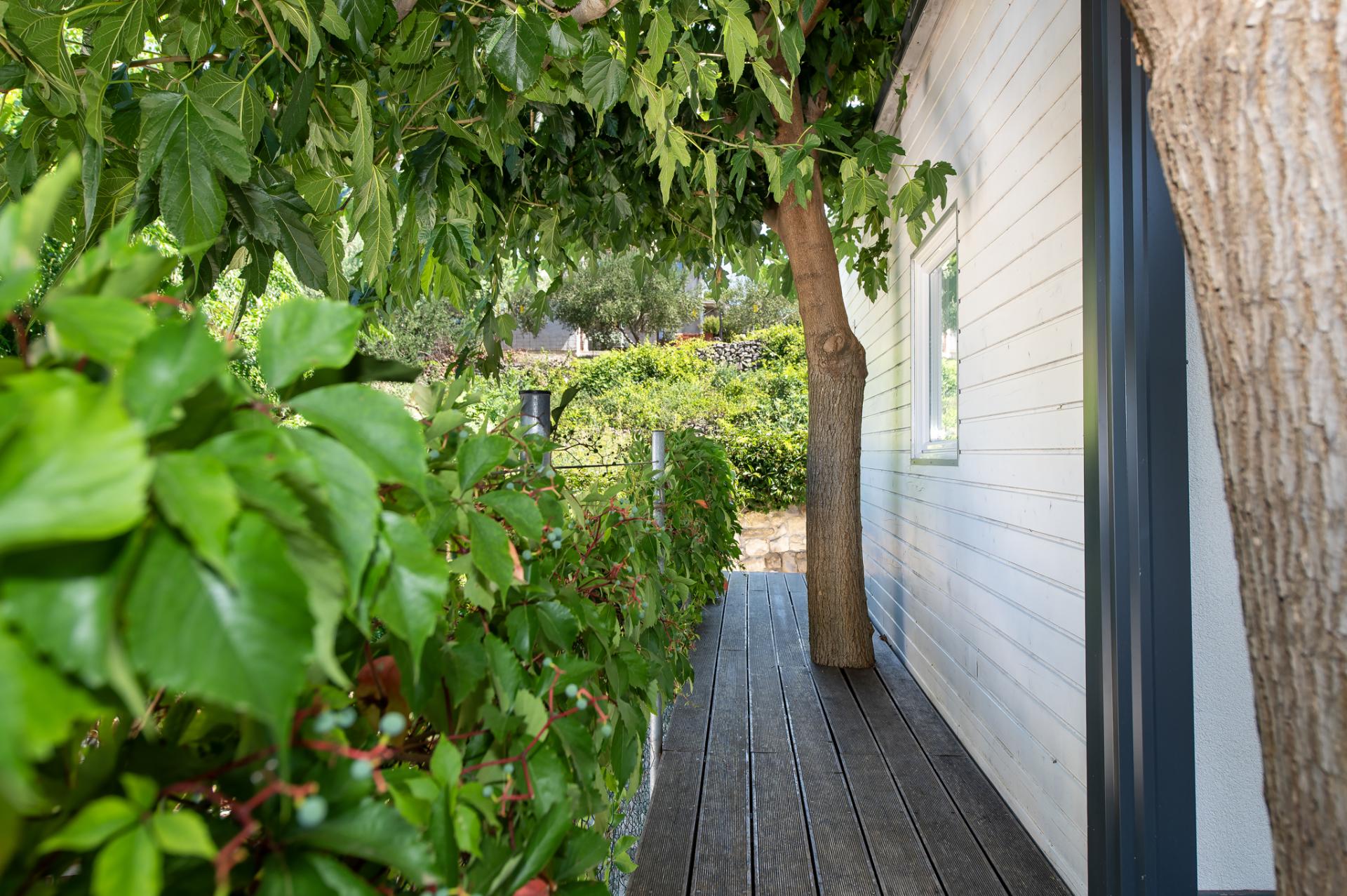 Dalla terrazza si estende una magnifica vista sulla baia e spiaggia. La terrazza ha 15 mq con tavolo e sedie. Nelle vicinanze (al massimo 20 metri oppure più vicino e secondo la disponibilità) si trova il parcheggio che è gratis.
